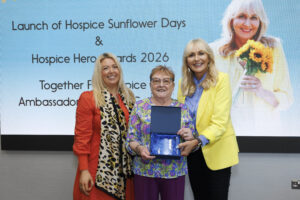 North West Hospice Charity was proud to recognise Kathleen Flanagan as its 2026 Hospice Hero in advance of the Hospice Sunflower Days campaign launch. Kathleen, a dedicated volunteer based in Carrick-on-Shannon, has been instrumental in leading and growing local fundraising efforts in Carrick-on-Shannon and its surrounding area, coordinating volunteers and driving strong community support year after year. She was honoured alongside 19 volunteers nationwide at a ceremony in St. Francis Hospice, Blanchardstown, with the award presented by Hospice Sunflower Days Ambassador Miriam O’Callaghan. Now in its 36th year, Hospice Sunflower Days will take place from 12–13 June 2026 with fundraising collections taking place right across our region, helping to raise funds for the charity supporting and enhancing specialist palliative care services across the North West.